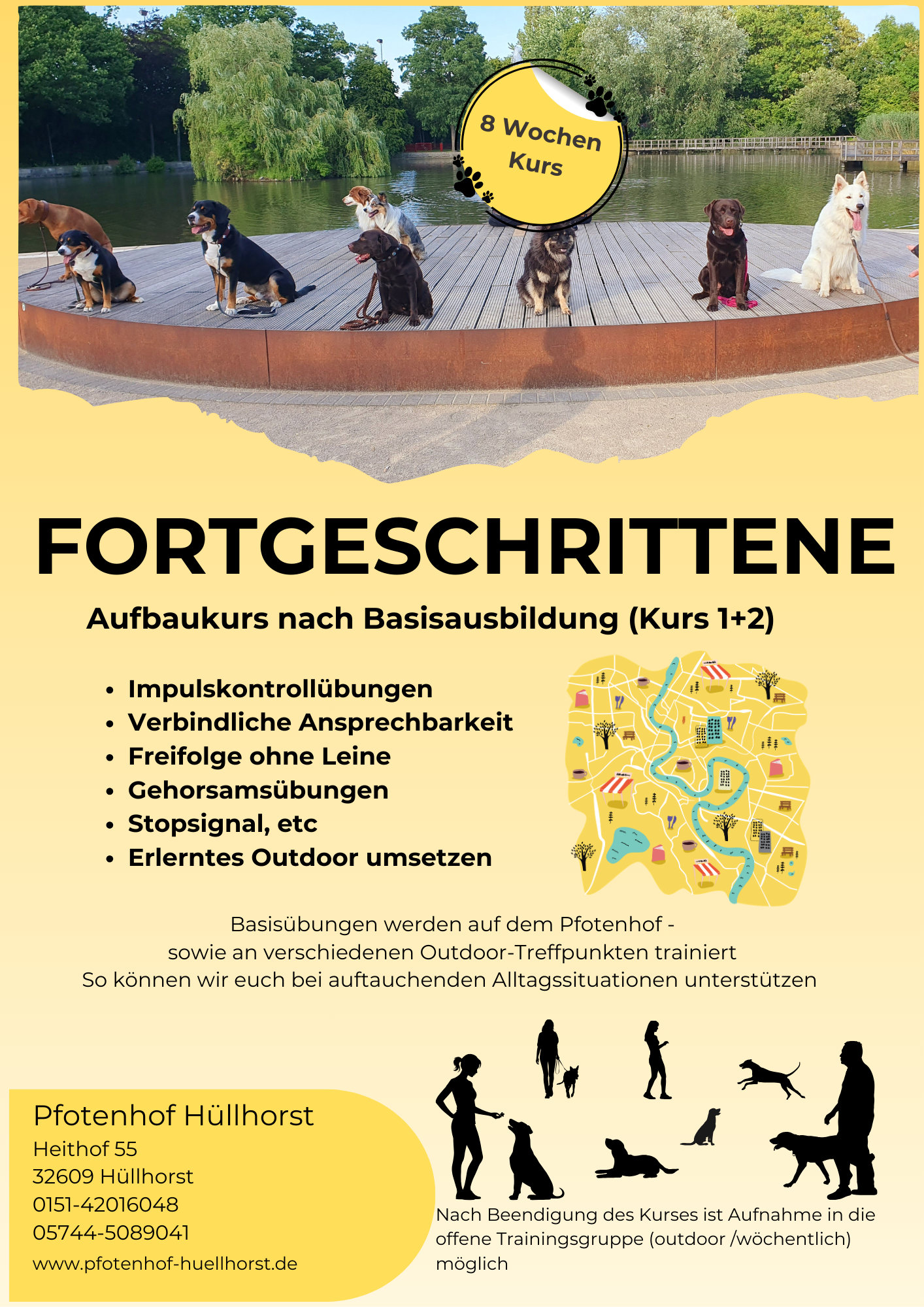 In dem Fortgeschrittenen Kurs können Sie sehr gut die bereits gelernten Dinge Ihres Hundes unter Ablenkung festigen und neues dazulernen. Wir legen Wert auf die Erziehung, die Ihnen den Alltag mit dem Hund erleichtern soll, deshalb wird der Unterricht auch außerhalb oder in der Stadt abgehalten werden und nicht nur auf dem Platz. Ebenso sollte der Spaß in einer Gruppe auch nicht zu kurz kommen.