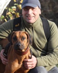 Seine Rhodesian Ridgebackhündin Jali hängt sehr an ihm - dieses müssen die Besucher im Hundefreilauf immer wieder feststellen wenn sie sehen, daß Jali über den Zaun hinweg ihr Herrchen anschmachtet, statt mit Artgenossen zu spielen ;-)... Sie ist eine tolle Hündin, die die praktische Prüfung der Hundetrainerausbildung mit Bravour bestanden hat. Seit November 2013 hat sie ihre Zuchtzulassung beim RRCD bestanden.
