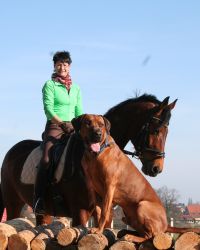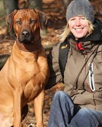 Ihr Rhodesian Ridgebackrüde Mitch reagiert auf kleinsten Fingerzeig - manchmal schon nur auf Augenkontakt. Er ist Angie sehr zugewandt und begleitet sie auch auf Ausritten mit ihrem Pferd. Ebenso ist er ein begeisterter Fan der Nasenarbeit. Die beiden sind eine große Bereicherung für den Pfotenhof, sowie im privaten Bereich.